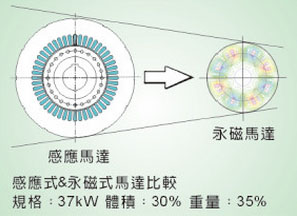 馬達(dá)使用永磁型轉(zhuǎn)子,不須通過(guò)電流製造磁場(chǎng)除耗能更低外,電機(jī)內(nèi)部產(chǎn)生廢熱也減少,散熱需求面積減少,馬達(dá)體積減少30%,重量減輕35%  |